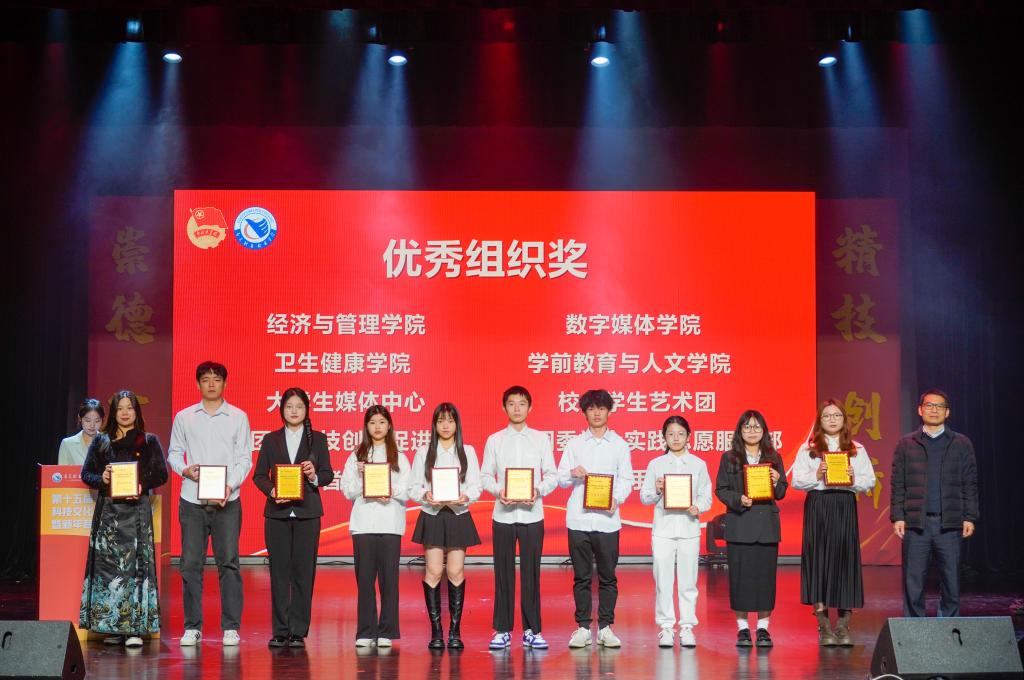 为表彰在科技文化艺术季中有突出贡献的集体和个人,共评选出“校园活动积极分子”“校园活动贡献奖”“校园团学新媒体年度十佳原创作品”“校园团学新媒体年度优秀原创平台”“二课之星”“我最喜爱的十大校园文化活动”“优秀指导老师奖”以及“优秀组织奖”8个奖项,与会领导为获奖集体和个人颁发奖牌、证书。