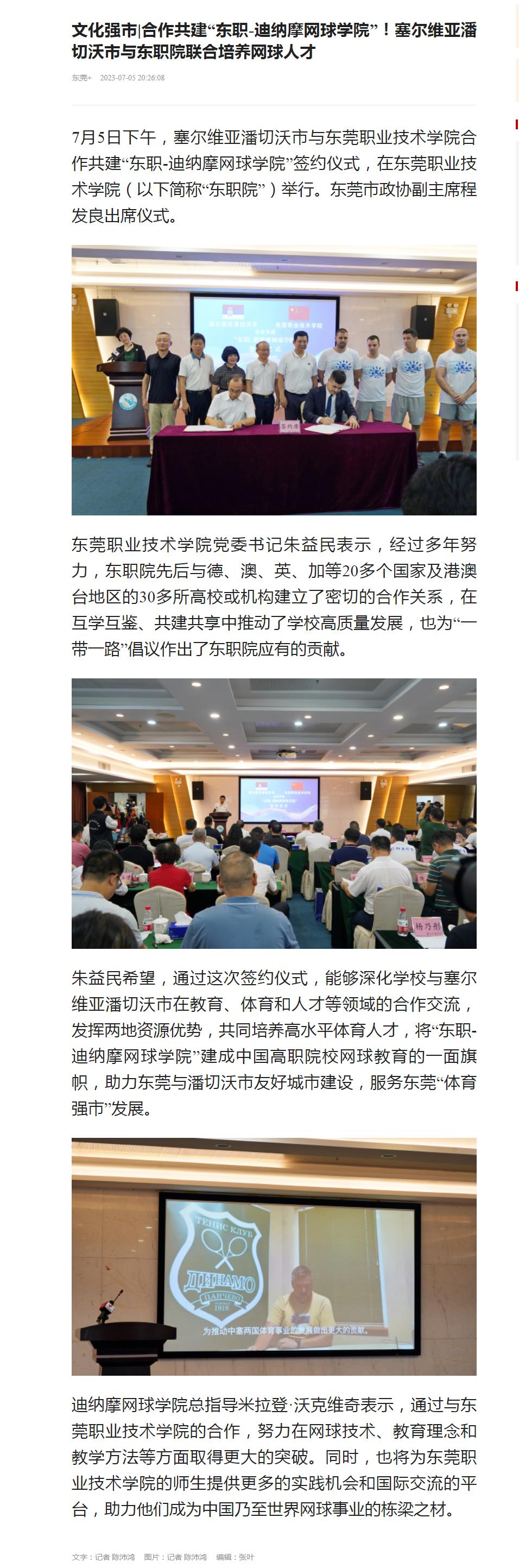 【东莞+】文化强市|合作共建“东职-迪纳摩网球学院”!塞尔维亚潘切沃市与东职院联合培养网球人才